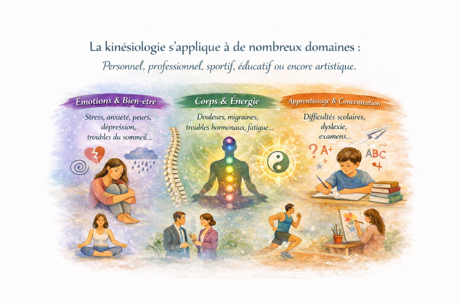 - Au niveau psycho-émotionnel : stress, anxiété, angoisses, peurs, phobies, dépression, dépendances, troubles alimentaires, manque de confiance en soi, troubles du sommeil…